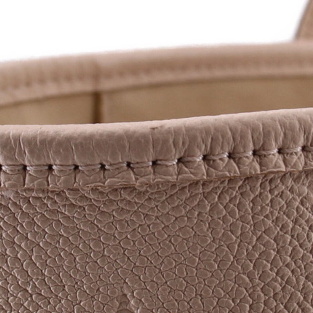 - Dual flat leather handles at top